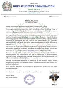 The Tangkhul and Kuki communities share a history of both coexistence and conflict. In June 2025, Tangkhul civil society organizations and Kuki village chiefs in the Litan area signed a formal undertaking at the Litan Police Station to resolve disputes and promote peace. However, recurring incidents—including land encroachments and armed confrontations—have continued to strain these fragile agreements.
