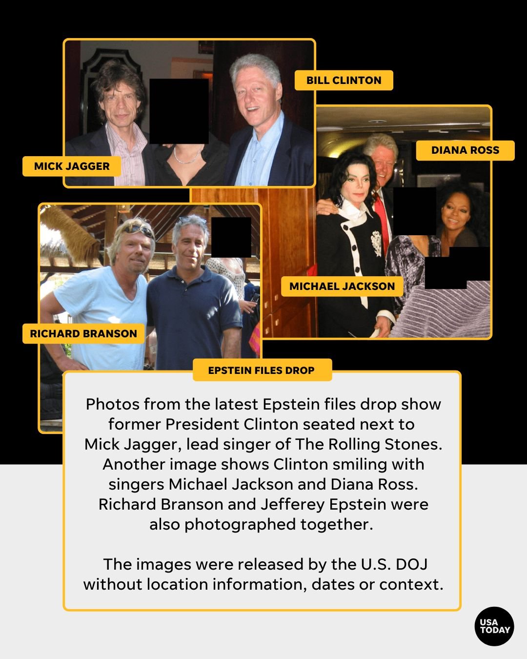 The King of Pop is seen in photographs alongside Jeffrey Epstein and other celebrities, including Bill Clinton and Diana Ross. These images appear to be social or professional gatherings. There is no evidence of criminal activity connected to Jackson in these files.