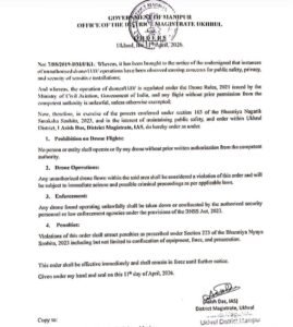 April 12, 2026: The district administration in Ukhrul, Manipur, has imposed a ban on the operation of drones and unmanned aerial vehicles (UAVs) without prior permission, citing growing concerns over public safety, privacy, and the security of sensitive installations.