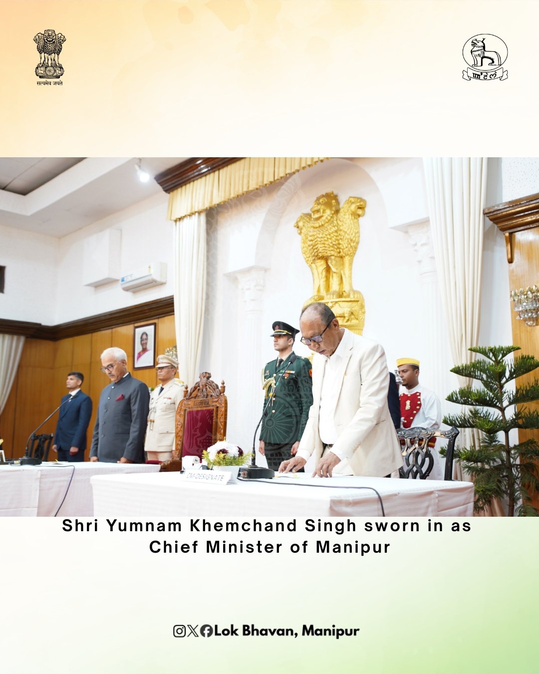 Shri Yumnam Khemchand Singh was sworn in as the Hon’ble Chief Minister of Manipur by the Hon’ble Governor of Manipur, Shri Ajay Kumar Bhalla this evening. Smt. Nemcha Kipgen and Shri Losii Dikho took oath as Deputy Chief Ministers, while Shri Konthoujam Govindas Singh and Shri… pic.twitter.com/23f7DGMadi