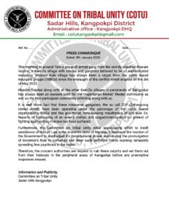 COTU stated that Kharam Vaiphei and other Kuki-Zo villages in the outskirts of Kangpokpi have remained vulnerable targets since the outbreak of ethnic violence on May 3, 2023, and alleged that valley-based insurgent groups (VIBIGs) have continued to pose a threat to the region.