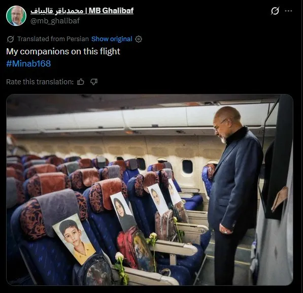 Iranian Parliament Speaker Mohammad Bagher Ghalibaf, who led the delegation alongside Foreign Minister Abbas Araghchi, shared images from inside the aircraft, writing: “My companions on this flight, Minab 168.” Other visuals showed delegation members standing beside the belongings of the young victims placed reverently across the cabin.