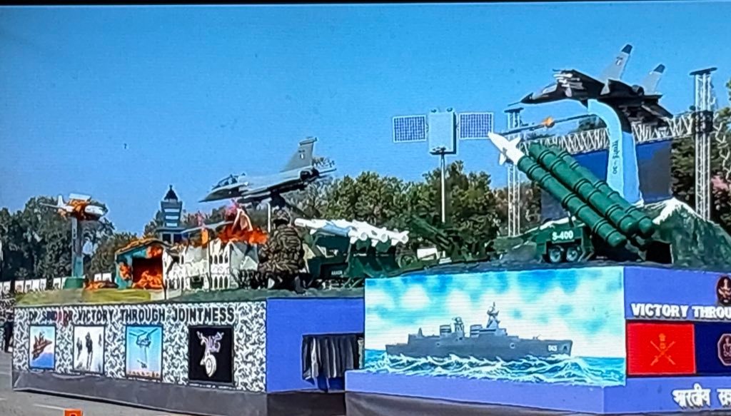 The Tri-Services tableau of the Indian Armed Forces prominently featured Operation Sindoor, illustrating victory through integrated operations and self-reliance in defence systems. The display included advanced platforms such as the BrahMos missile, Apache helicopters, Dhanush artillery, Bhishma and Arjun tanks, NAG missiles, among others.