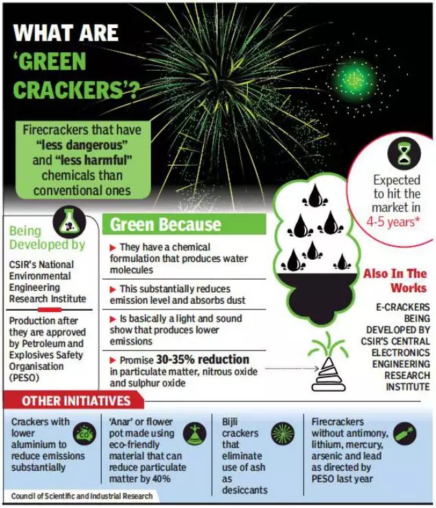 Green crackers are a new generation of firecrackers designed to reduce air pollution. Unlike traditional firecrackers, which release high levels of smoke, carbon, and harmful chemicals such as barium, lithium, lead, and mercury, green crackers are made using cleaner fuels and low-emission chemicals. They also produce less smoke and noise, making them environmentally friendly while still preserving the festive spirit.
